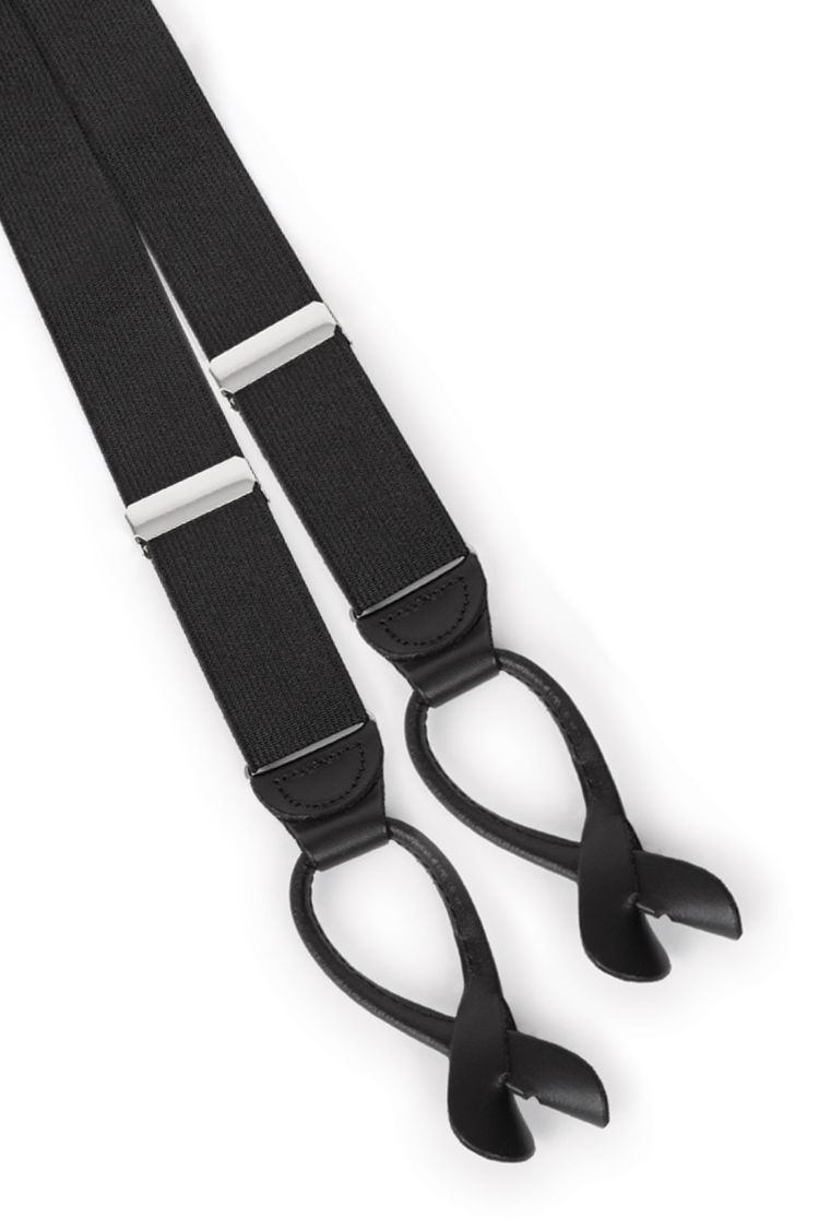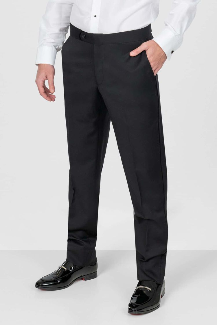 - Shown with slim fit pants with an exact waist, buttons to accommodate suspenders, and satin leg striping
