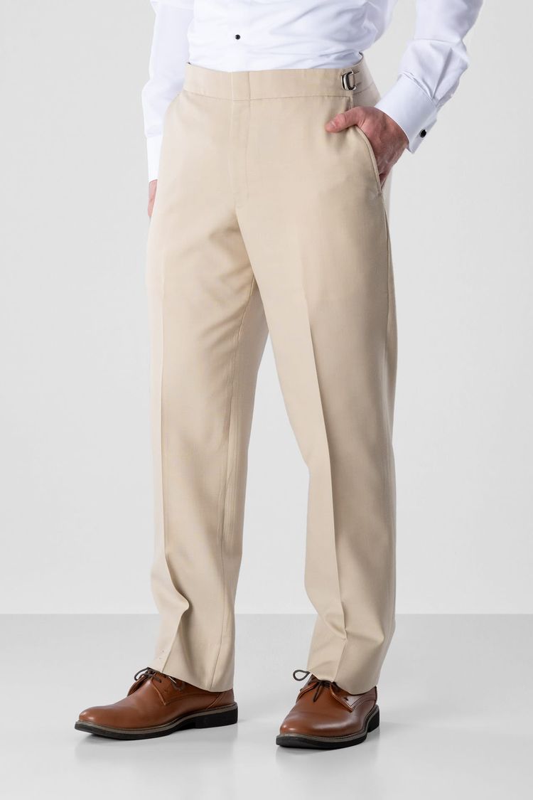 - Shown with modern slim fit pants with no stripe